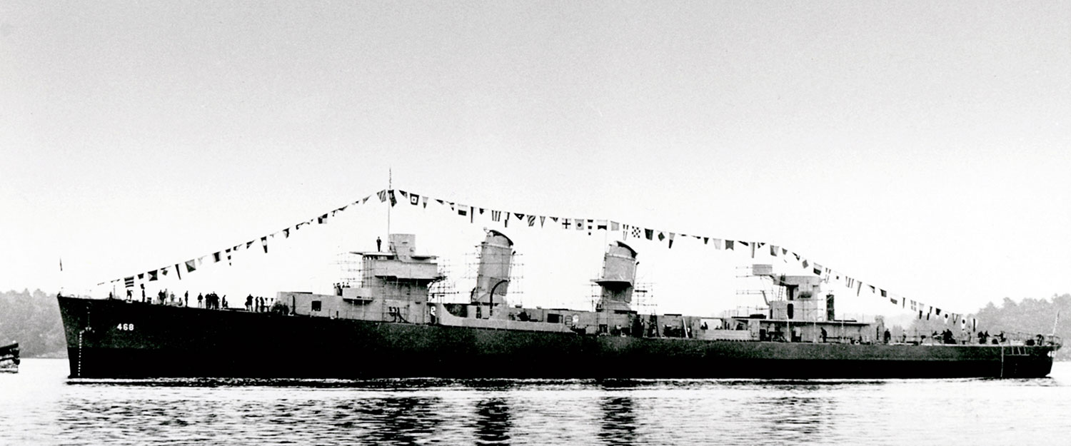 USS Taylor (DD 468) was named for Rear Admiral William Rogers Taylor and was the second U.S. Navy ship to bear the name. Mrs. H. A. Baldridge, wife of Captain Harry A. Baldridge, USN (Ret), was invited to sponsor the ship on Launch Day, 7 June 1942. By tradition, a ship’s sponsor bestows good fortune and divine protection on the vessel and all who sail in her. Mrs Baldridge did her job well: USS Taylor never suffered crippling damage or lost a man in battle.